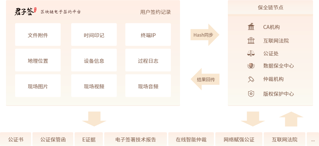 君子签在线电子合同签约平台,创新“ 区块链 + 司法 + 电子签约 ”模式,邀请权威司法机构加入保全链节点,签署信息同步存证至司法机构。